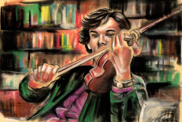 Sherlock holmes and his violin. Pastel on velour paper. 2013, By ole Mejlvang Hedeager. www.unikart.dk A3 40*30cm.