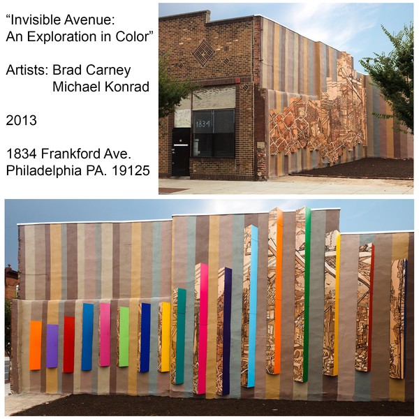 This project displays a lenticular mural design. Standing across the street at just the right angle, you can view a layered blind contour drawing created by students in my Mural Arts summer class, along with fellow artist Michael Konrad. The image represents the juxtaposition of the neighborhood. We chose a subtle color pallet to represent how people may chose to view the neighborhood, and even miss the true value of the clutter that sometimes crowds a community. If viewers walk into the lot and turn around, a bright colorful wall of stripes will activate the space, and show you what hides under the surface of the brick and mortar, the cyclone fences, and the bleakness that some streets offer us.