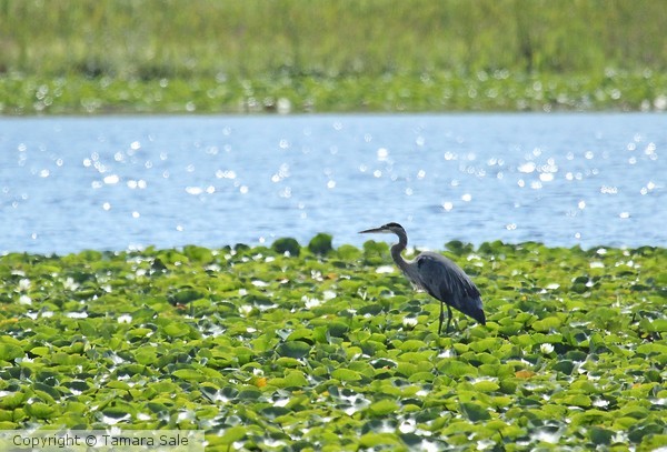 Heron amongst the lily pads, looking for fish.