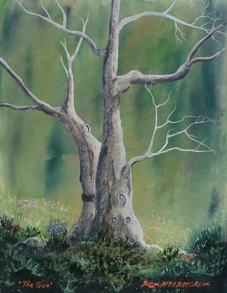 ‘The Tree’ Like a ghostly tombstone among the wildflowers, this beautiful gum tree stands majestically, as a memorial to its own former life. Interactive acrylic and gloss on canvas 36x28cm (14 x 11in) "God's creation, my inspiration. He put the Art in my HeArt" https://bluethumb.com.au/rexwoodmore