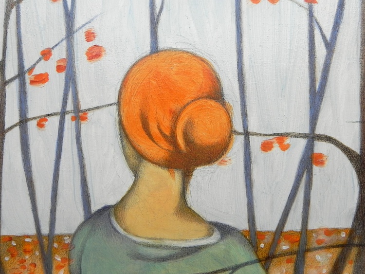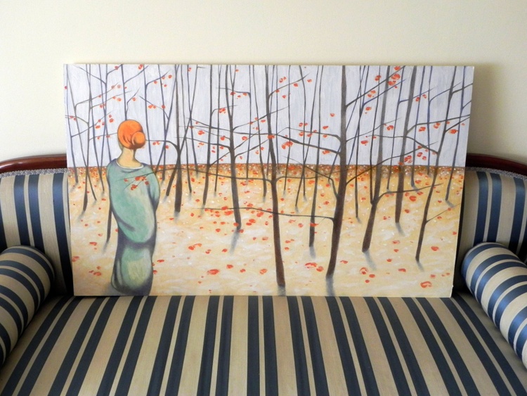 Oil and graphite on wood panel, 106 x 63 cm, original sold. This painting was inspired by a scene in the movie "Grand Budapest Hotel". The two protagonists are travelling on a train, crossing winter melancholic landscapes, covered by snow and with few leafless trees emerging from it. The scene gives a sense of expectation, and what is dead in it suggests a new beginning.