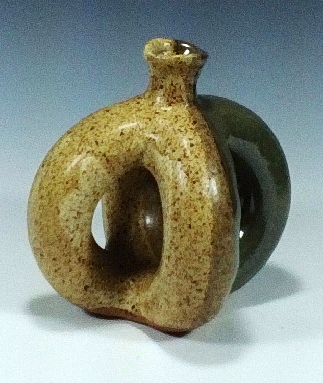 Many years ago I learned to throw a hollow donut, or Torus. Lately I was looking for some other uses of the form, by cutting and rejoining the form with other forms. This one was made by cutting one and joining it to another. I then added a spout to make it useful.