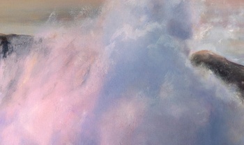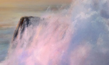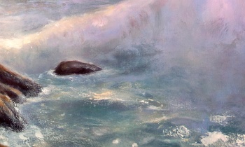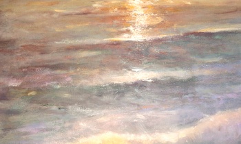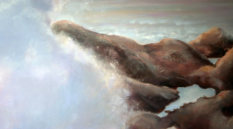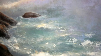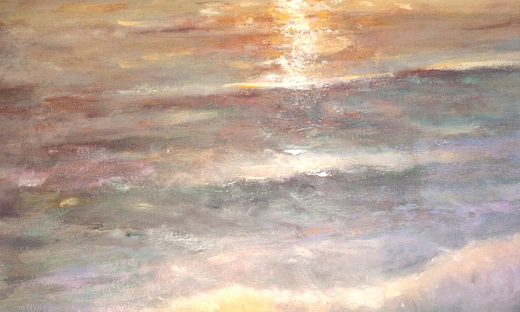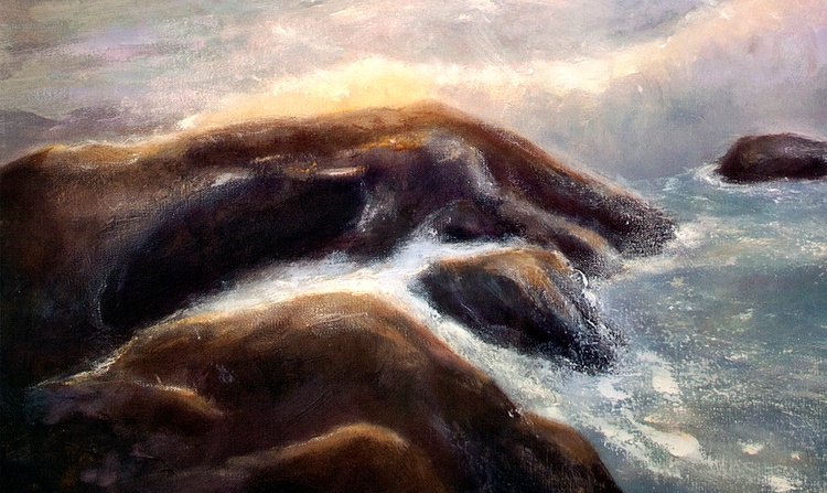 California Coast is an original oil on a gallery wrapped canvas. No framing is required as all sides are painted. The canvas measures 48 x 72 x 1.5 inches. The inspiration for this painting is derived from the natural beauty on the central coast of California. Fine art collectors will notice the pastel sky in which the sun is setting, casting a warm glow across the waters. A crashing wave sifts the fine ocean mist across the rocks.