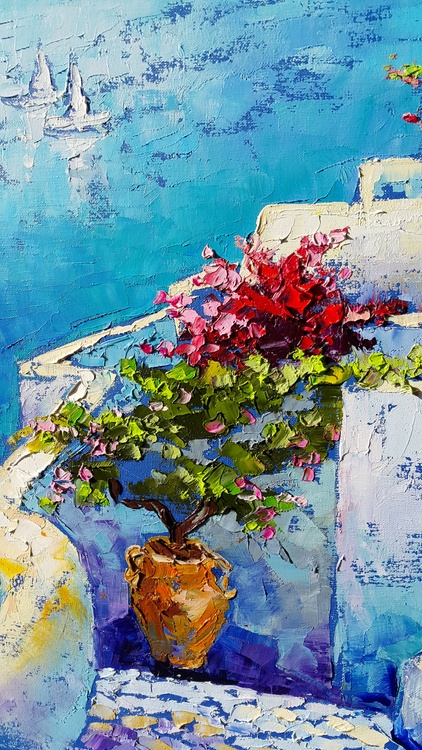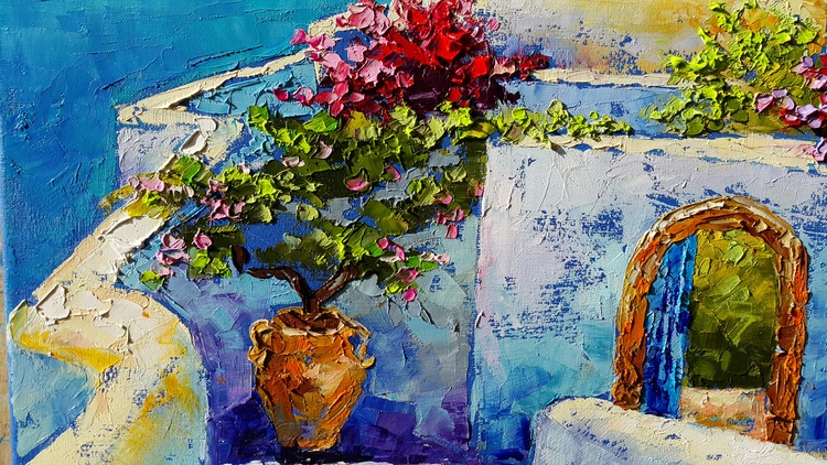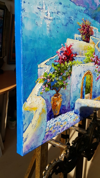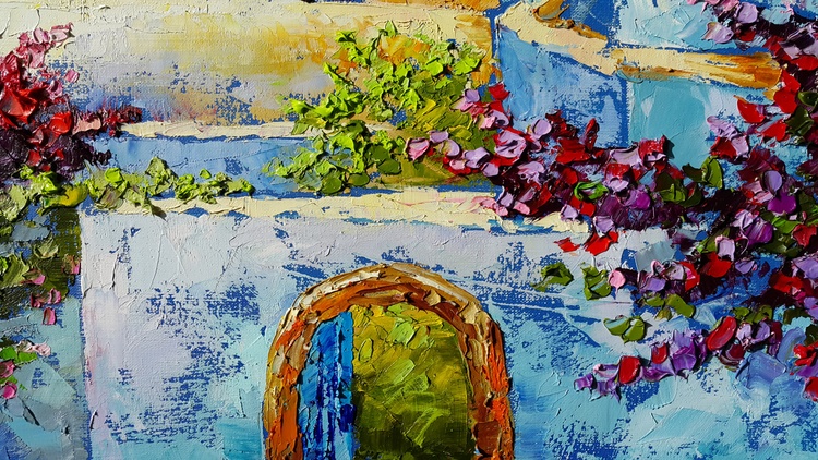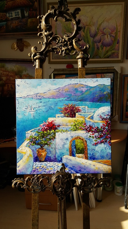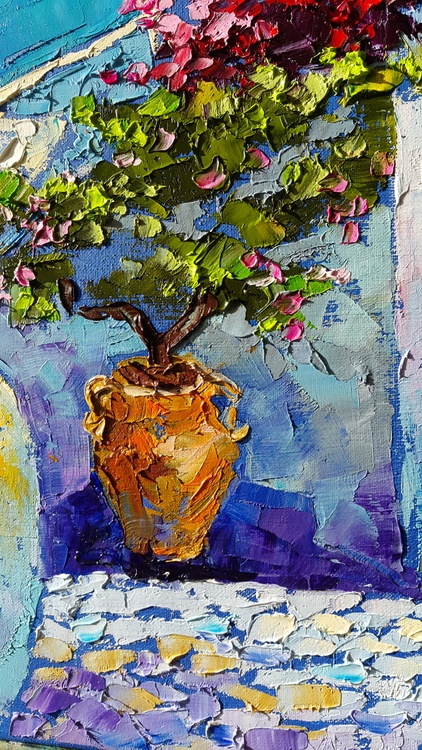 Painting Santorini in flowers - Victoria Lapteva, Ukraine, oil, canvas. The painting sold unframed. Standard delivery is 12-14 days Express delivery possible - 2-4 days (DHL, UPS, FedEx). Exspres service is not included in the price - let me know of the need for urgent delivery before you make a payment.