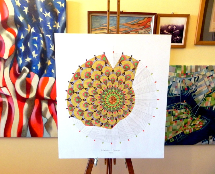 From the series “Diagram”, pencil and oil on paper, 44 x 50 cm, 2015. In my youth at the school, certain lessons were inevitably boring. When the distraction peered, inadvertently I began to scribble the pages of the books, filling with drawings their blank borders. The hour of history, or philosophy, gave easy ideas: I copied the portraits of philosophers illustrating the beginning of each chapter in the textbook. The math class gave beautiful diagrams: their geometries structured the space, providing backgrounds to fill with decorations, figures, pictures. Maybe it was the insight that those same geometry hid himself a sort of aesthetics, an inexplicable and axiomatic beauty, like when we are aware of it in front of nature, without being able to give it an explanation. This sort of drawings make me think of a kind of prayer, a repetitive but pleasant action, like the work of an embroiderer, like a spider weaving its web. My sold works are never rolled but always packed flat. I put them between two sheets of acid free paper with paper protection for the corners, than close in a plastic envelope. The envelope is stiffen with a sheet of polystyrene on both sides, and the whole thing is completed with layers of cardboard. The package is also protected with bubble packaging. Usually the artwork is shipped in 2/3 days after receiving the payment. Certificate of Authenticity included.