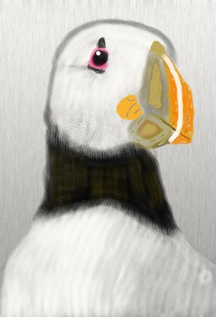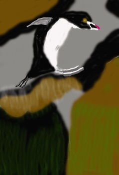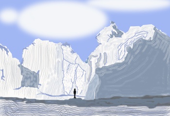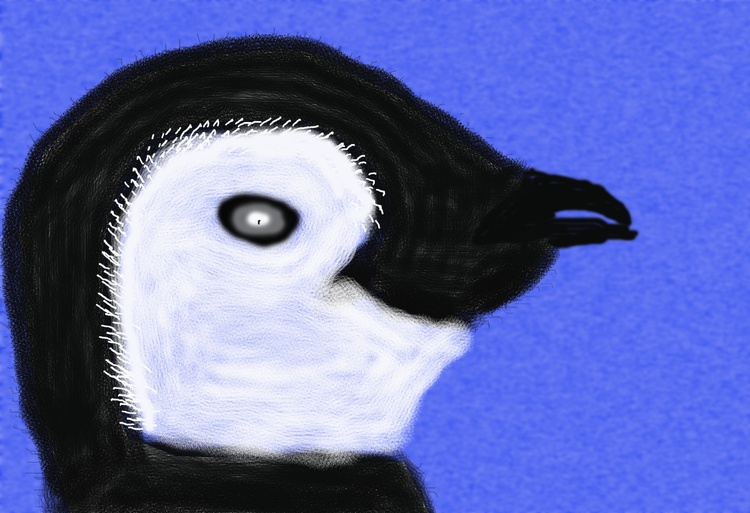a big fat penguin standing beside a stream, on an iceberg with ice behind