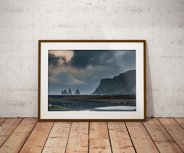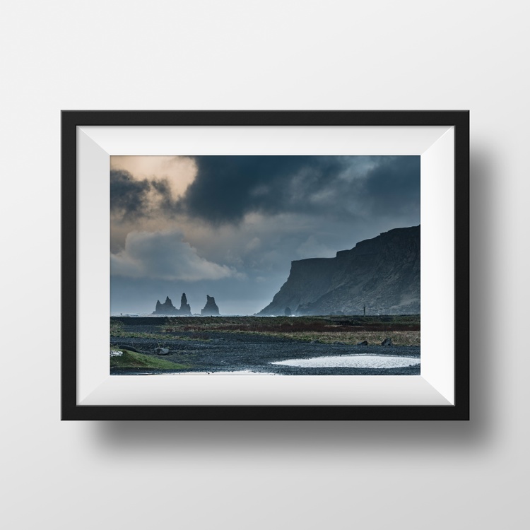View of Black Sand Beach rock formations in Vik, Iceland.