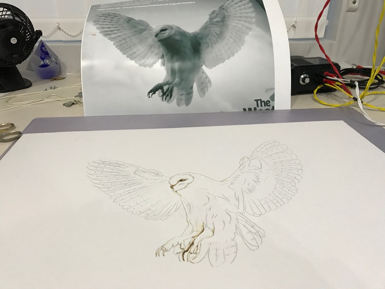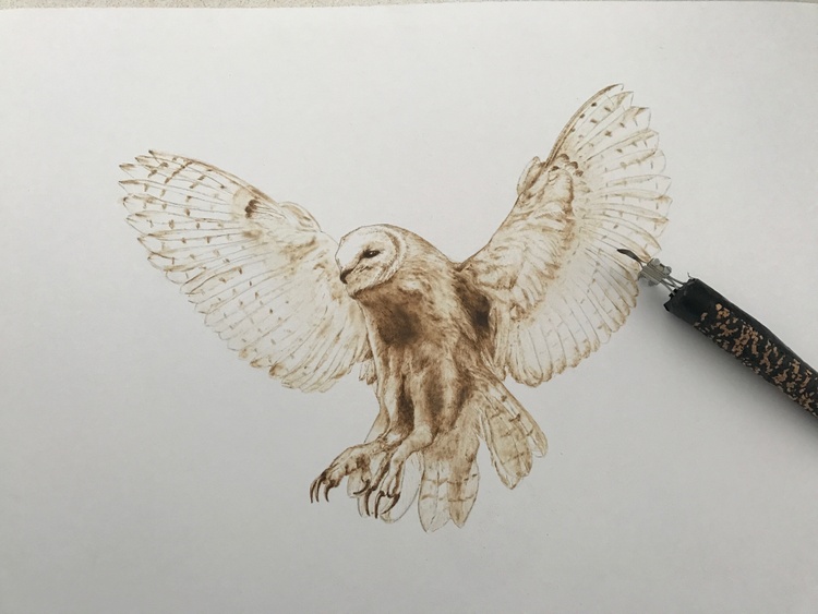 Pyrography burnt onto mounting board, 56 x 44 cm . Reference Photo found in a Sussex wildlife lottery advert, photographer unknown.