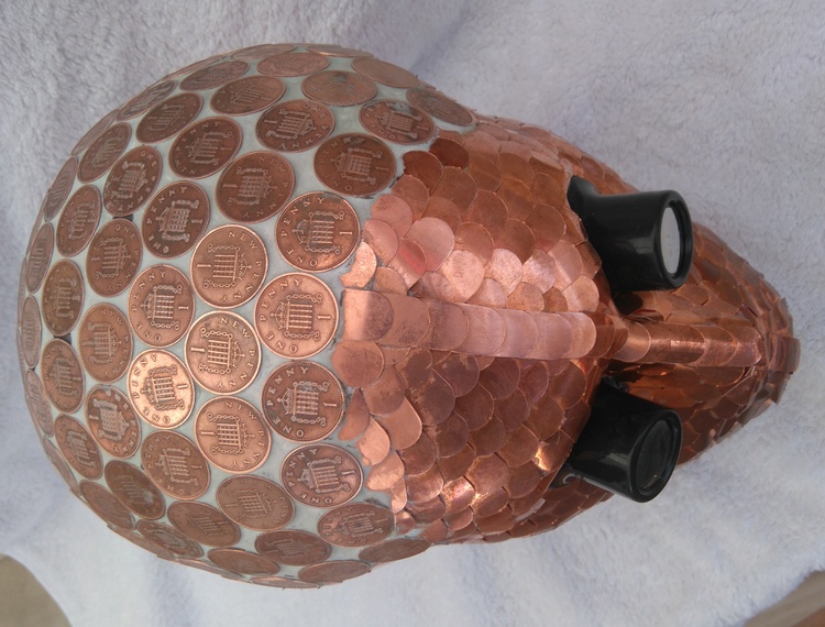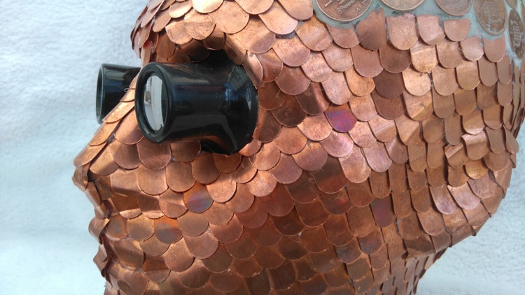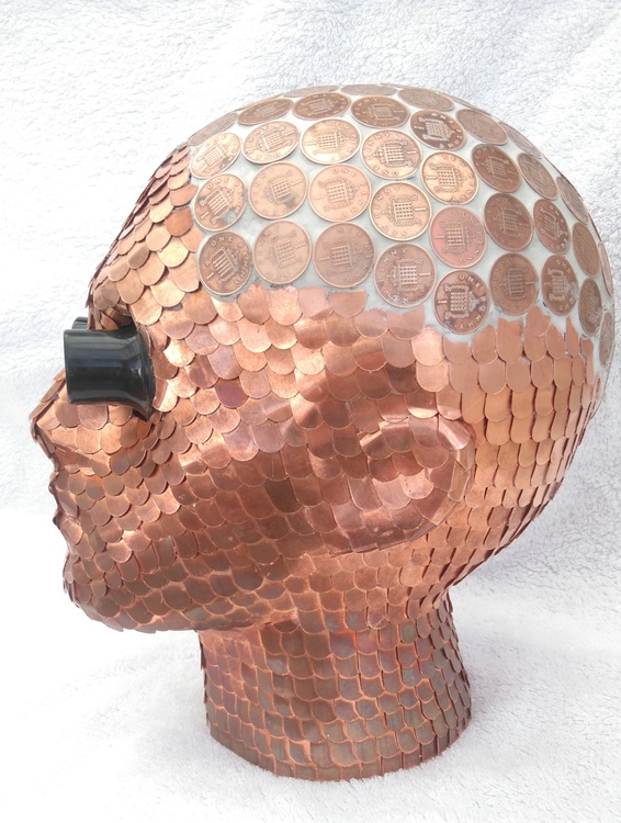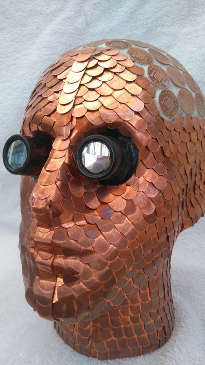 A life size polystyrene head covered in hand punched copper scales and one pence coins, with Jewellers lenses for eyes.