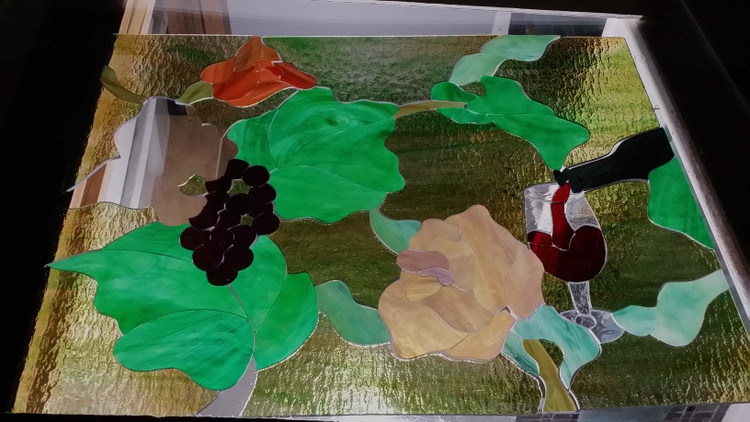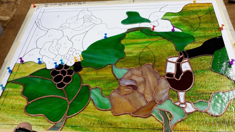 Finish Built On Bench & Awaiting Next Stage Of Soldering Upon The Copper Foil. Carefully Colored Roses Alongside Mature Grapes Create A Perfect Setting For Pouring & Tasting The Delight Of The Vine..See More Images Of Light Table Work, Grain Retention Cutting & Building Process Below