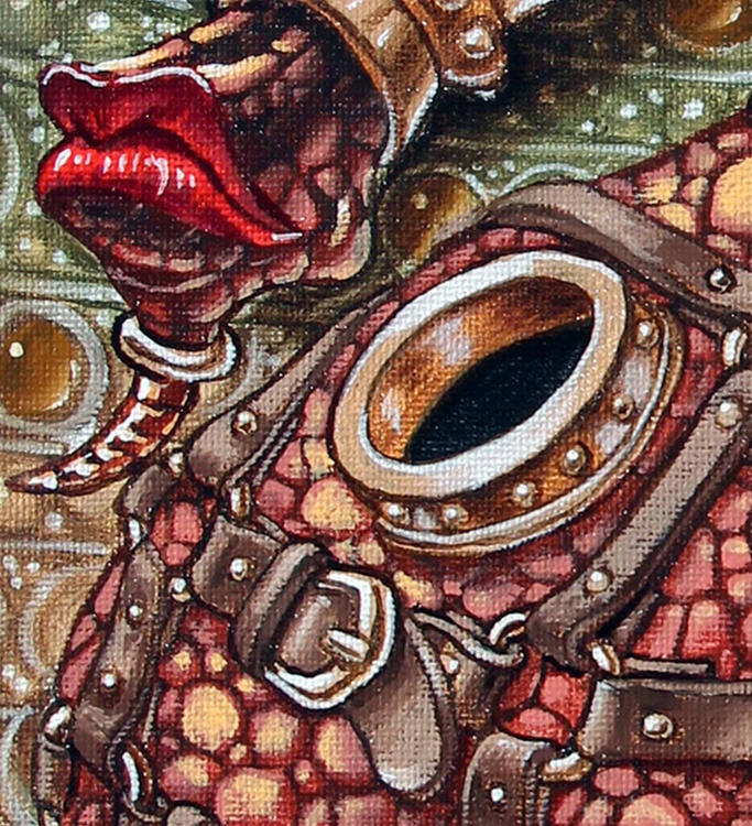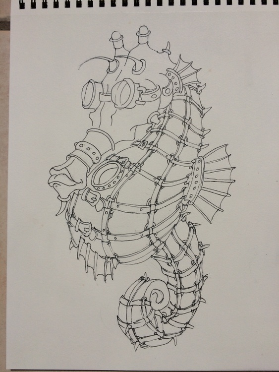 "Seahorse in steampunk" 2017 36x51 cm Oil on Canvas, Pasted on Cardboard. Copper leaves