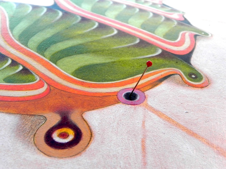 From the series “Please do not kill butterflies”, pins, oil and pencil on paper, 50 x 28 cm, 2016. ORIGINAL SOLD. Please, all these dead animals ... Of course, not everyone of us can or want become vegetarian. Sure, in some cases, maybe, the medical experimentation needs them to get results. But we really have to kill them for our frivolous activities? ... Is it necessary to have so many pink pigs die in front of a camera? Do we really need to dissect sharks in formaldehyde, to starve stray dogs tied to a chain in the corner of a gallery, or to make innocent ants go crazy in twisted tubes of plexiglass? To make these drawings, no butterfly was killed.