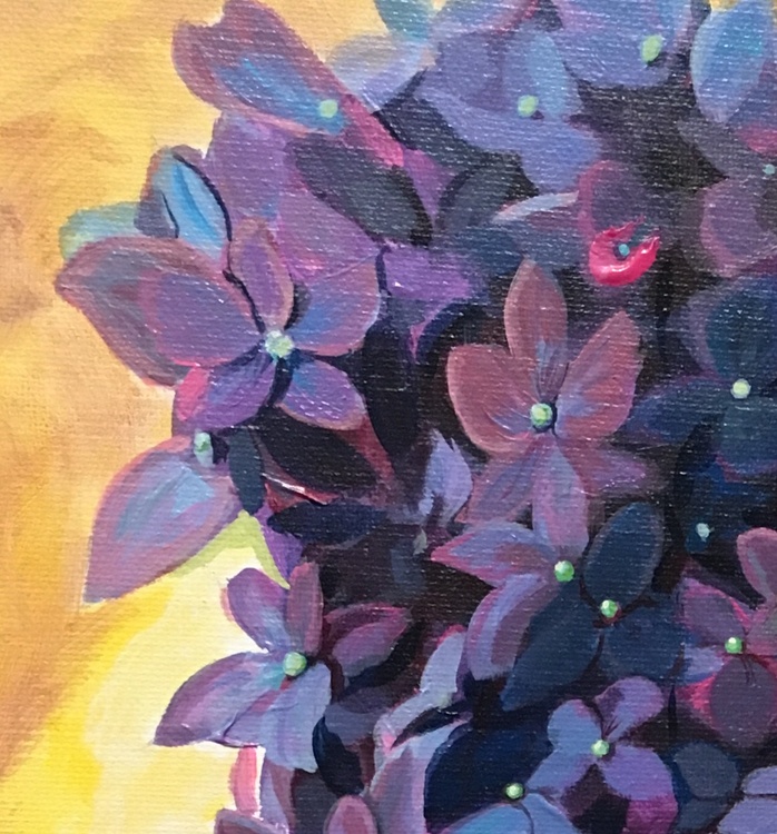 Still life while the hydrangeas are fully flowering in our garden. Such a beautiful flower. This still life is somewhat divorced from complete realism except for the base of the Vase. The centers of the flowers are detailed green pearls.