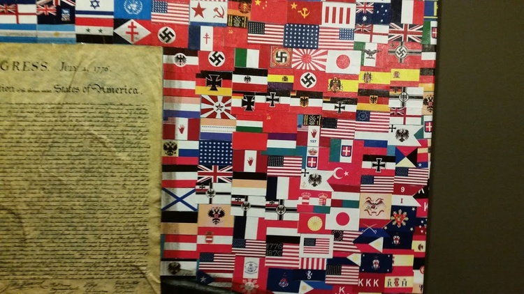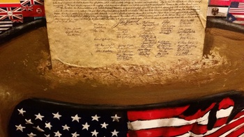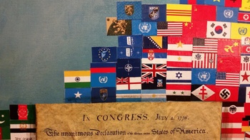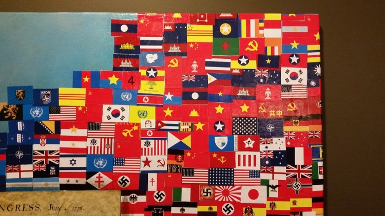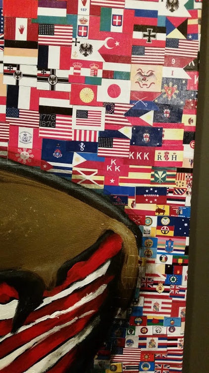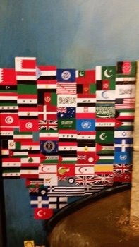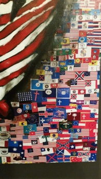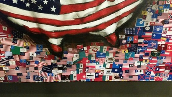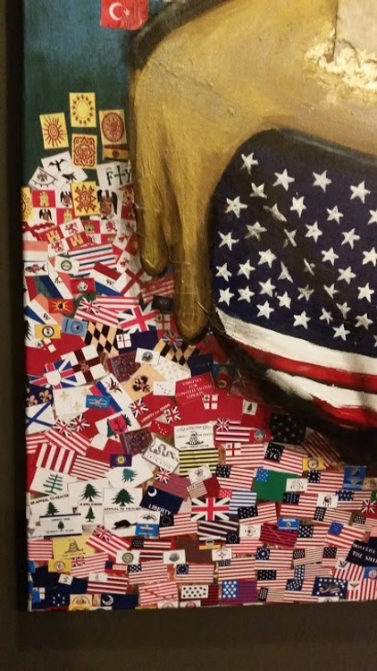 The Melting Pot is a 40 x 48 oil on canvas painting that is full of symbolism. The melting pot represents the cultural alloy that makes the U.S. Strong. Out of many different cultures, we became something unique. The American culture is so desirable that people have braved many hardships to come here. .........................................................The many flags on the painting represent the nations of the world and the fires that forged our country out of conflicts. The U.S. was blessed by God because it was founded on Judeo-Christian beliefs of Justice, Equality, and Fairness. From a Christian point of view, this represents the makeup of Heaven where every race is represented equally. ....................................................There is gold in the melting pot which represents the people blending together in a way that makes the whole more valuable than the parts. Our differences makes us more interesting and stronger giving us flavor. The blending takes place when we follow God's founding principles recorded in the Declaration, that "All Men Are Created Equal." The wrinkles in the Declaration of Independence represent the ancient desires of people to live and worship freely, to speak ones mind, and to be able to work to make a better life. ..................... The founding of our country starts with discovery and conflict. The flags and symbols of countries and tribes, as well as flags of our internal conflicts surround the melting pot. Every conflict brings us more immigrants escaping tyrants. All the conflicts in the world today reminds us that we have an obligation to stand up for what is right regardless of personal loss and the only antidote for hate is love.