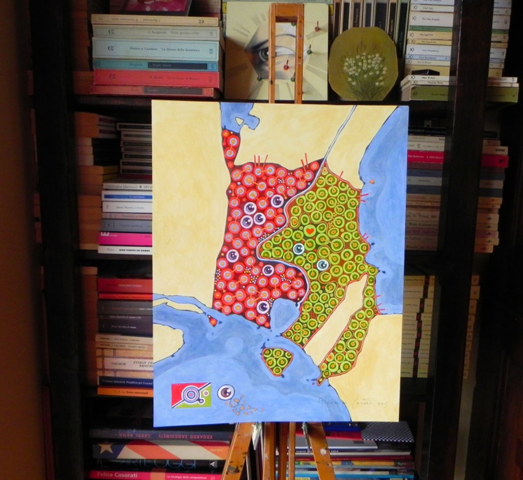 From the series “Nations”, oil and pencil on paper, 35 x 45 cm, 2015. In these drawings I create a map of an imaginary nation. The invention starts with the tracking on a perimeter that is the boundary. Within this boundary, with colored backgrounds, dashes and symbols, I can create new meanings and hierarchies between the various areas. But of course, everything is invented, and the more I can get away from real cartographic representations, the more the original significance weakens and gives way to new, unexpected interpretations. The point that originally represented the position of a city on the map can grow up to become a big bubble colored and decorated with new symbols, the tracks indicating roads and paths can be deformed and can be enriched with textures and hatches that change the meaning, the same boundary may vary in different parts of the map, becoming thick or thin, light or dark, hard and defined or changeable and permeable. The final result is no longer about the geography of a place, but rather the representation of something abstract, like a memory, a mood or an emotion. My sold works are never rolled up but always packed flat. I put them between two sheets of acid free paper with paper or cardboard protection for the corners, and then they are closed in a plastic envelope and bubble packaging. The envelope is stiffen with a sheet of polystyrene on both sides, and the whole thing is completed with a cardboard casing outside. Usually the artwork is shipped in 2/3 days after receiving the payment. All my artworks are original unique paintings, signed. Certificate of Authenticity included. In case of sale shipping is worldwide free.