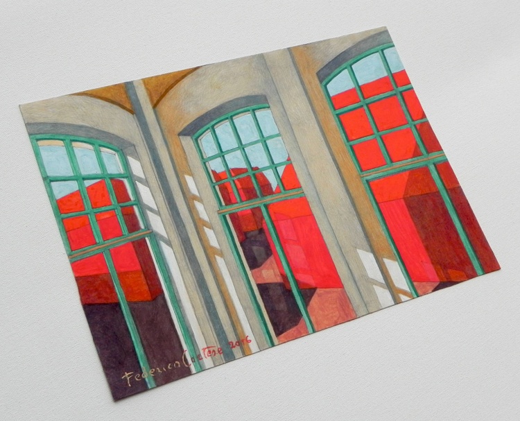 from the series "Abandoned rooms", oil on paper, 21 x 15 cm, 2016. ORIGINAL SOLD. This series of paintings was inspired by the metaphysical landscapes of De Chirico. I have always been fascinated by their clear vision of the architecture, with the precise design of the shadows, almost anticipating the modern use of three-dimensional modeling software. In the way I feel, however, more introverted and almost unsociable, the outer space is transformed into a closed one, private and protected, from which the human presence is totally gone away. In those rooms then, it may happen that some strange objects and some unexpected decorations appear, suggesting that the person who lives there has overcome the lack of relationship to the outside world with the richness and complexity of his inner world. My sold works are never rolled up but always packed flat. I put them between two sheets of acid free paper with paper or cardboard protection for the corners, and then they are closed in a plastic envelope and bubble packaging. The envelope is stiffen with a sheet of polystyrene on both sides, and the whole thing is completed with a cardboard casing outside. Usually the artwork is shipped in 2/3 days after receiving the payment. All my artworks are original unique paintings, signed. Certificate of Authenticity included.