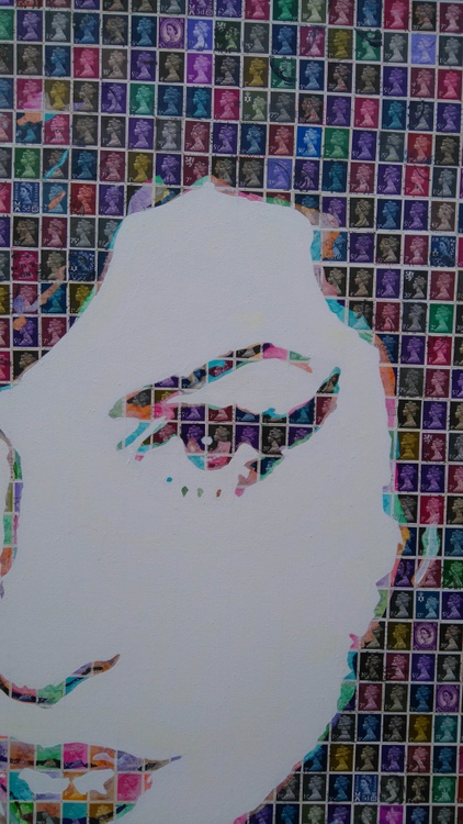 Amy Winehouse in hand cut British stamps on canvas, finished off with acrylics and mat varnish. 30" x 40"