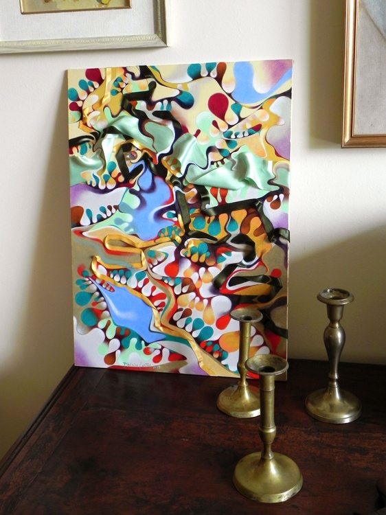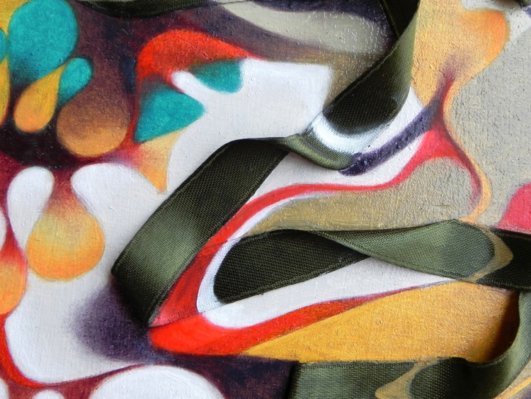 An original piece from the series “Extrusions”, oil, fabric and a glass bead on wood panel. 40 x 56 cm. Original sold. This series of works was originally born from the following idea: I imagine a sign on the paper, like a cut, from which other signs, shapes and colors emerge, as if it were a sort of material capable of generating the painting, a sort of Pandora's pot of painting. By the time this initial idea has become more complicated. That sign on paper came out of paper, it has become three-dimensional, a piece of fabric on the sheet, a sort of pocket from which the paint spills, and eventually other simple objects spill, such as little glass beads, that suddenly become precious just because they are now on the surface of a work of art.