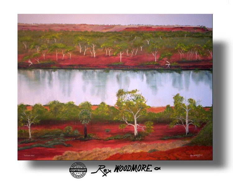 Outback Oasis. A true oasis, near Crossing Pool, in Millstream National Park, Western Australia. Acrylic on stretched canvas 75x100 x4cm. Sold Rex Woodmore Australian Fine Art ‘God’s creation-my inspiration ’Find me online: 'Art sale Rex Woodmore'