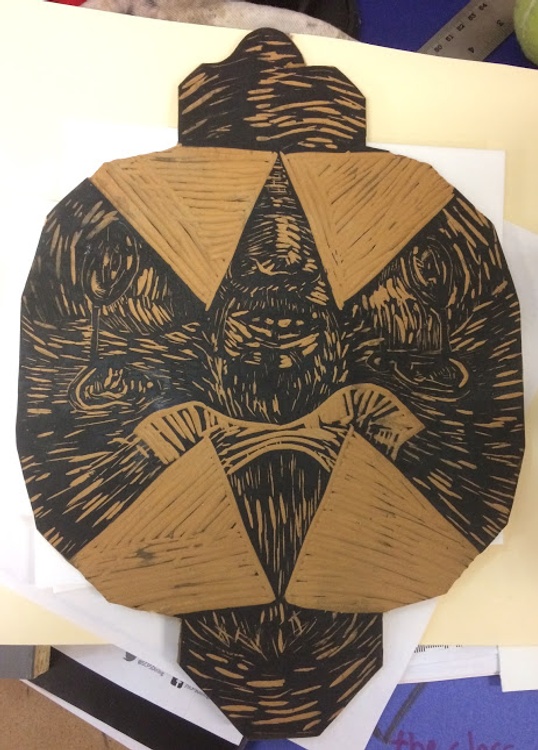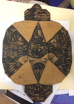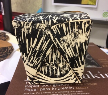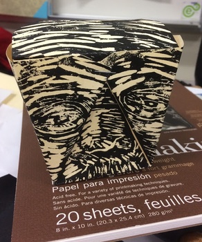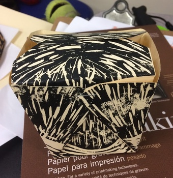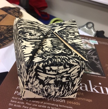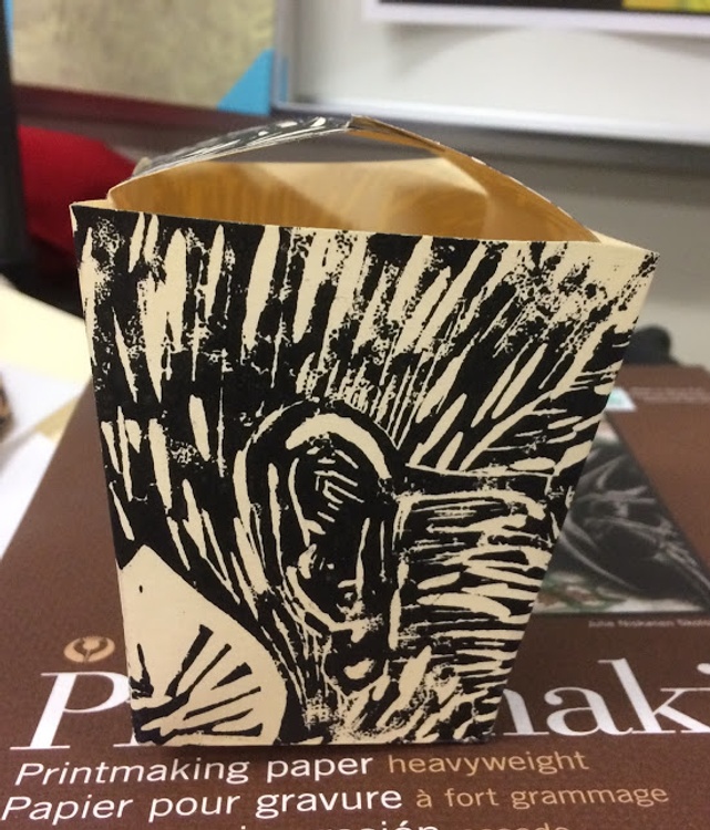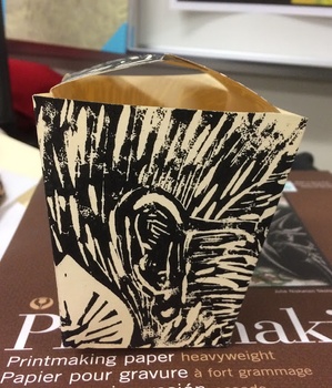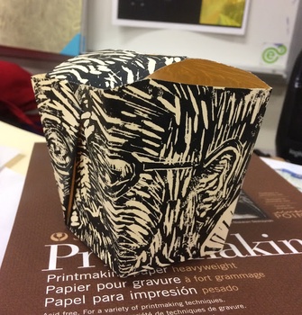 This linoleum block was originally carved for an art contest, but it faded quickly due to the coating on the box. I am repurposing the block and printing on a semi-thick oak tag type of paper, then folding the boxes using a bone folder. Making a run of 5 boxes. Please see other views of the box in my portfolio. Copyright Ari Sutton 2018