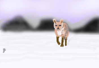 A young fox walks through the snow, coming out of the mountains. Gausian blur makes the whole image appear soft but the fox is clear.