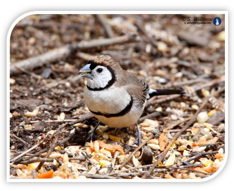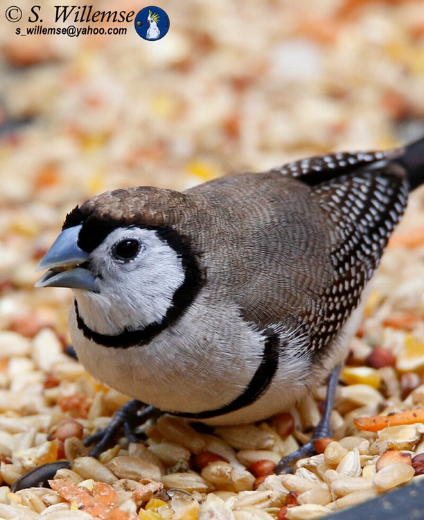 A little Double-barred Finch is shown in a textured background illustrating the seed he was standing on in a slightly abstract way.