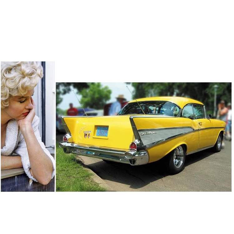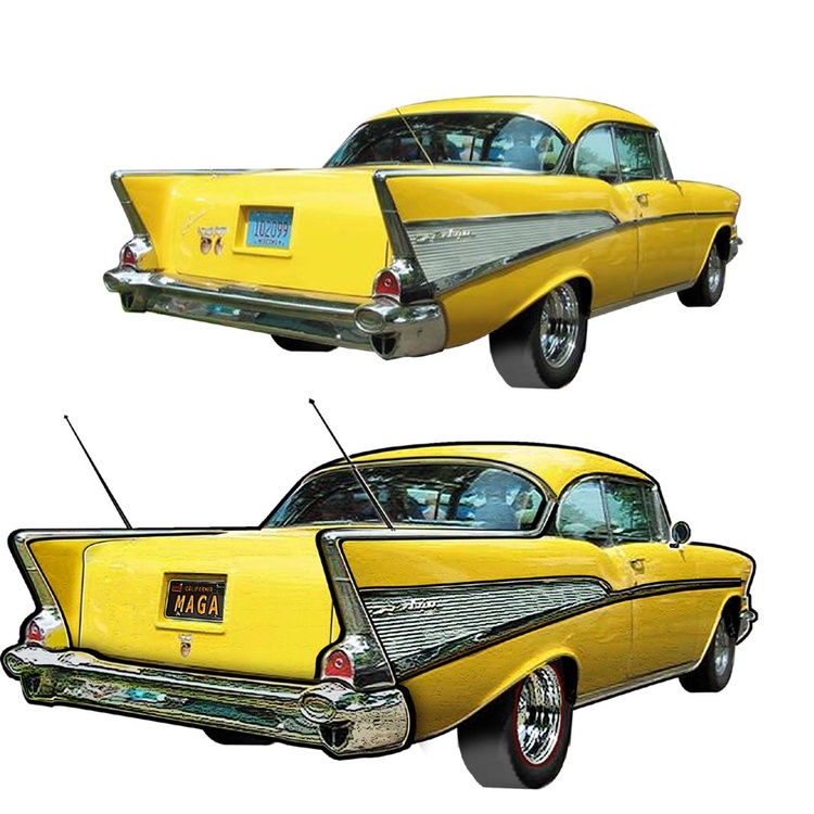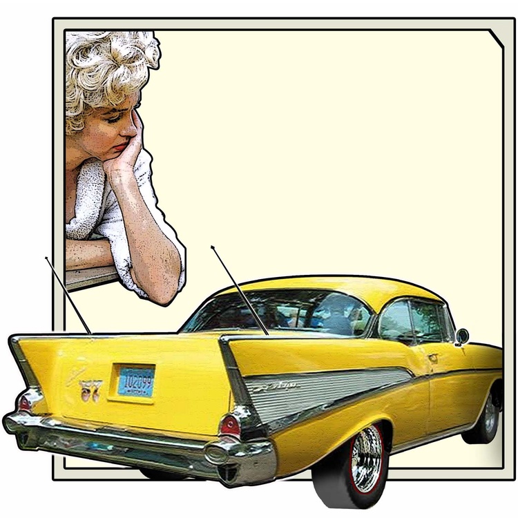 A 1957 Chevy Bel Air sports coupe. The 57 Chevy was called a Baby Cadillac by some because of some similar styling to Cadillacs of the time, but this car (and design) stood on its own – despite some wannabe design critics.