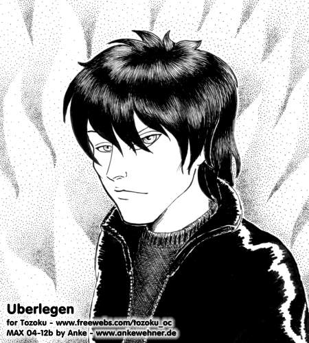 Somehow I felt like drawing that guy whos name looks a bit like "Überlegen", which means "to ponder" in used as a verb, or "superior" when used as an adjective, just misspelt ;) No, that is no screentone in the background. Yes, that is stippled by hand... Why, yes, that must mean I must be nuts. Thank you for asking. I would be really happy with this image, if he wasn't cross-eyes and the hair didn't look like a wig, and if maybe his head wasn't that much too big for his shoulders, but, eh, I've done worse. I used about any pigment liner I could get my paws on for this, and a copic marker for the jacket so that I don't go crazy drawing that much black with some fineliner. MAX webpage: max.alternatedimension.com