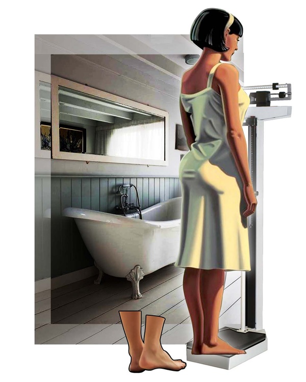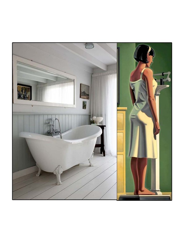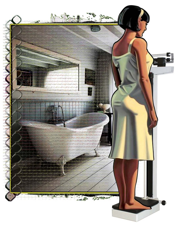Why would someone have a medical weight scale in their bathroom? Could it be because it's fun to draw & adds decorative drama to the image?