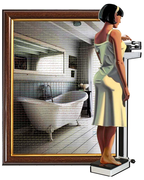 a digital painting re-touch of a bathroom scale in use. $ 11.00
