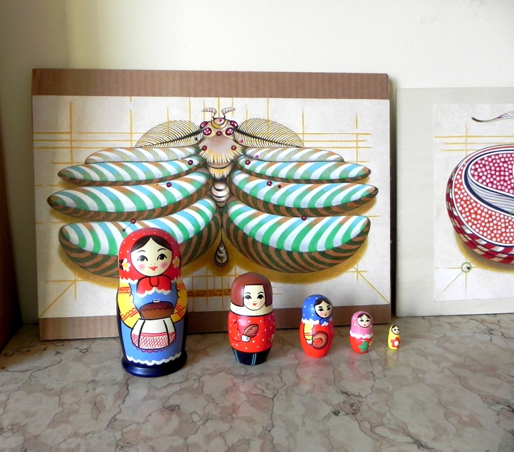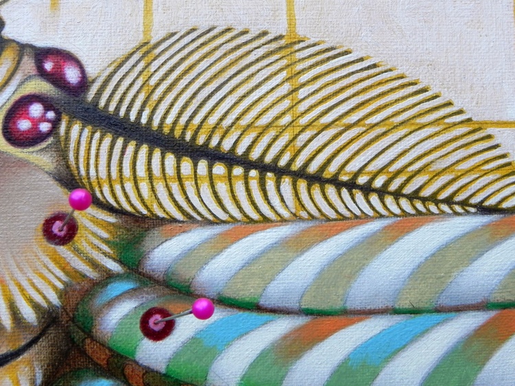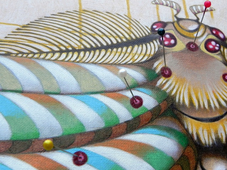 An original piece from the series “Please do not kill butterflies”, pins, oil and pencil on paper, 50 X 30, 2017. Original sold. Please, all these dead animals ... Of course, not everyone of us can or want become vegetarian. Sure, in some cases, maybe, the medical experimentation needs them to get results. But we really have to kill them for our frivolous activities? ... Is it necessary to have so many pink pigs die in front of a camera? Do we really need to dissect sharks in formaldehyde, to starve stray dogs tied to a chain in the corner of a gallery, or to make innocent ants go crazy in twisted tubes of plexiglas? To make these drawings, no butterfly was killed.