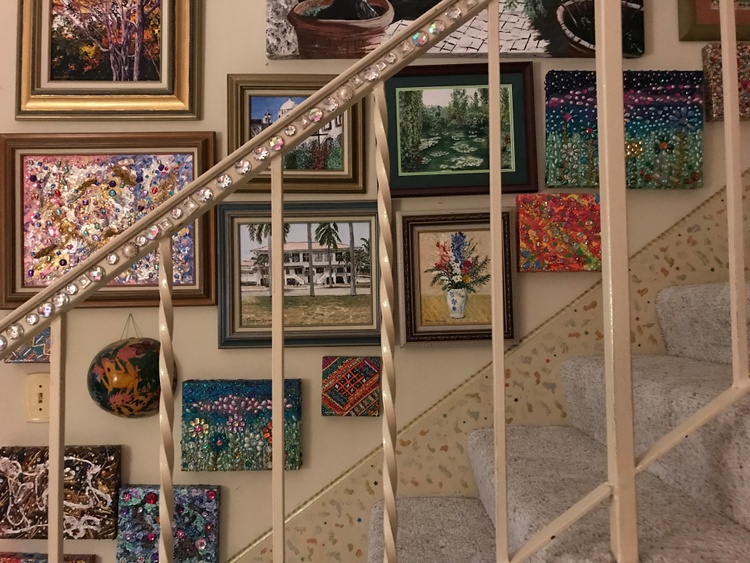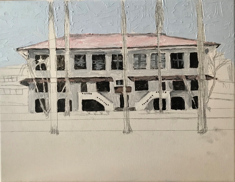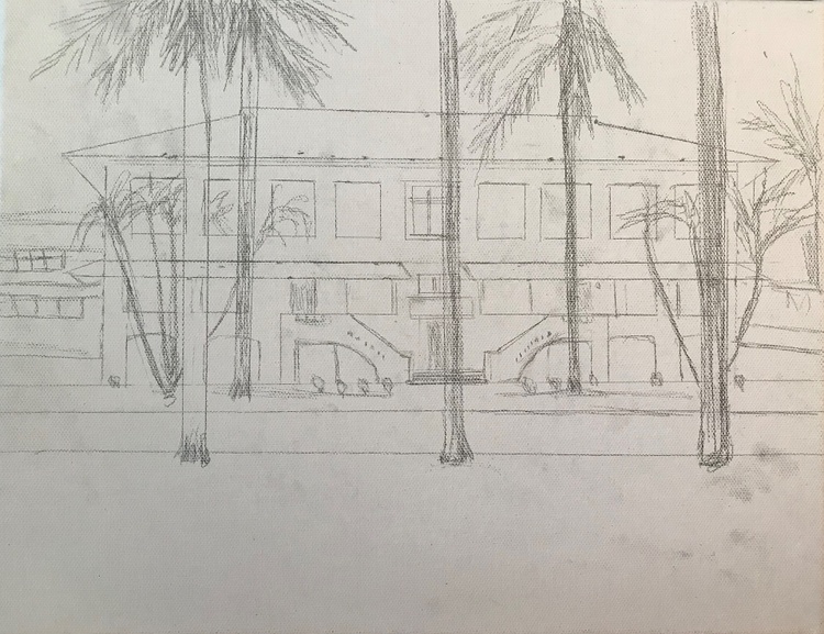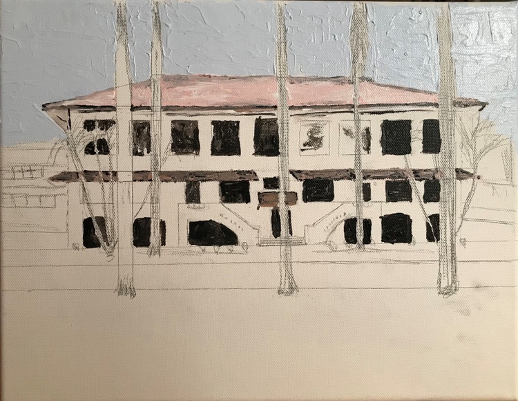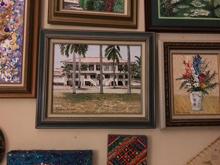 "715 El Prado Balboa Panama Canal Zone" I finished this yesterday. George Fitzgerald asked me to paint this & that he had a photo, which he sent. Carole Thompson Corey also wanted me to paint this. You see, we 3, with the Harrison's, lived here at the same time. Fitzgerald's upper left, Thompson's Upper right, Harrison's lower left and De Vore's lower right. You will see that our outside light was on when George took the photo years ago. I balked since his photo did not inspire me at all. A US Government house like all on the Prado, Barnaby Street, Tavernilla Street up both sides of Sosa Hill & on the military bases & other CZ towns. The large expanse of grass in front was mostly dead, obviously photo was taken in dry season. (I had fun painting grass & took its boring look away) When I painted my Ozark & Alma Houses they sat in the mountains with beautiful trees; very inspiring. This 715 does not have any beautiful trees; palms are just Huge plants with big leaves. The only possibly inspiring thing was that I had lived here. George won out, because I decided to paint it for him & Carole. Easy it was Not, but happy I painted it I am. Very happy. Thank you George. The Balboa High School Gymnasium was behind this house; you can see it on the left. That was a good thing for me in my Senior year, because I had Cheerleader practice after school every day in that gym. My Sophomore & Junior years I lived on the other side of Balboa and had a long way to walk after Cheerleading practice & on Ballet lesson days, I had to run with my school books across town after Cheering to ballet. A little history about El Prado; the houses are historic & were built first with the Administration Building that sits atop Ancon Hill at one end of the Prado. The road that goes to the BHS gym bisects it making each grass section the exact dimensions of a Panama Canal Lock; the 2 grass sections together are the size of Miraflores Locks since Miraflores has 2 locks, 2 steps. We lived on the Prado twice. First time I was in early grade school & we lived in the house next to this 715, on the right side, & we lived in the exact place "D". However we lived in the top right first & moved down when the bottom right became available. A little deviation from my Christmas paintings, but I still wish you all a Very Merry Christmas & Happy Hanukkah!