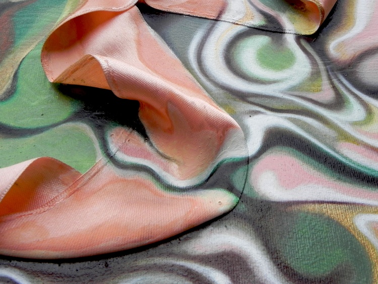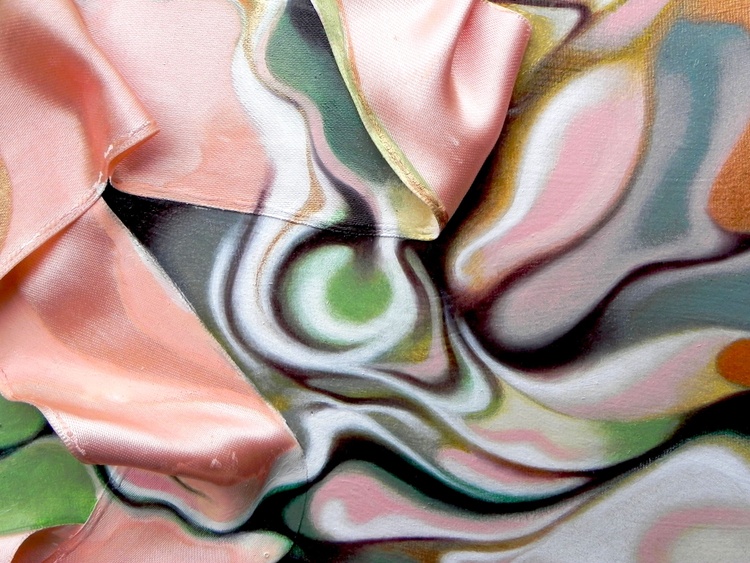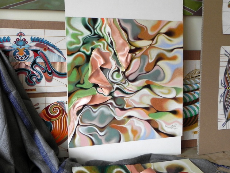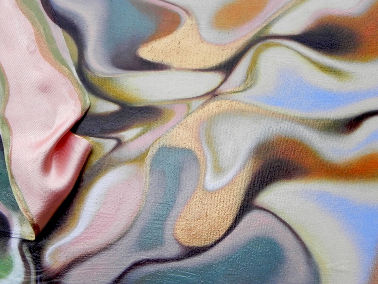 An original piece from the series “Extrusions”, oil, fabric on paper. 40 x 40 cm, 2017. This series of works was originally born from the following idea: I imagine a sign on the paper, like a cut, from which other signs, shapes and colors emerge, as if it were a sort of material capable of generating the painting, a sort of Pandora's pot of painting. By the time this initial idea has become more complicated. That sign on paper came out of paper, it has become three-dimensional, a piece of fabric on the sheet, a sort of pocket from which the paint spills, and eventually other simple objects spill, such as little glass beads, that suddenly become precious just because they are now on the surface of a work of art.