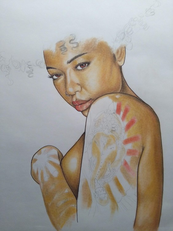 What do Y'all think that the background in this painting should be, Graffiti, sort of an Inner-City look, perhaps a hot and dusty New Dehli, India because of the tattoo of Geneshu on her arm or just the cooling presence of a waterfall, with her standing in front of a pool of water? I'm interested in what you think! This is done, by the way, with chalk and colored pencil and is 36 x 24 inches in size.