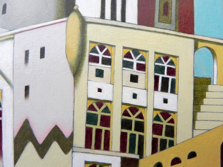 An original piece from the series “Houses on the water”, oil on thick paper, 36 x 70 cm, 2018. In this series of paintings I try to blend together the architectural and monumental elements of a place or a city. It 'a bit like recalling to the memory a journey made in the past: it will produce many confused and overlapping images. The title of the series wants to reclaim the idea of a fluid memory, moved like water, and confused like a mirage. Original sold.