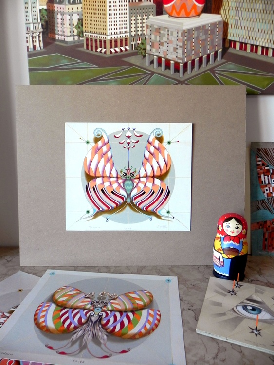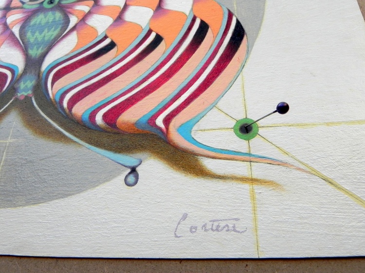 An original piece from the series “Please do not kill butterflies”, pins and oil on paper mounted on a wood panel, 35 x 30 cm, 2018. ORIGINAL SOLD. Please, all these dead animals ... Of course, not everyone of us can or want become vegetarian. Sure, in some cases, maybe, the medical experimentation needs them to get results. But we really have to kill them for our frivolous activities? ... Is it necessary to have so many pink pigs die in front of a camera? Do we really need to dissect sharks in formaldehyde, to starve stray dogs tied to a chain in the corner of a gallery, or to make innocent ants go crazy in twisted tubes of plexiglas? To make these drawings, no butterfly was killed.