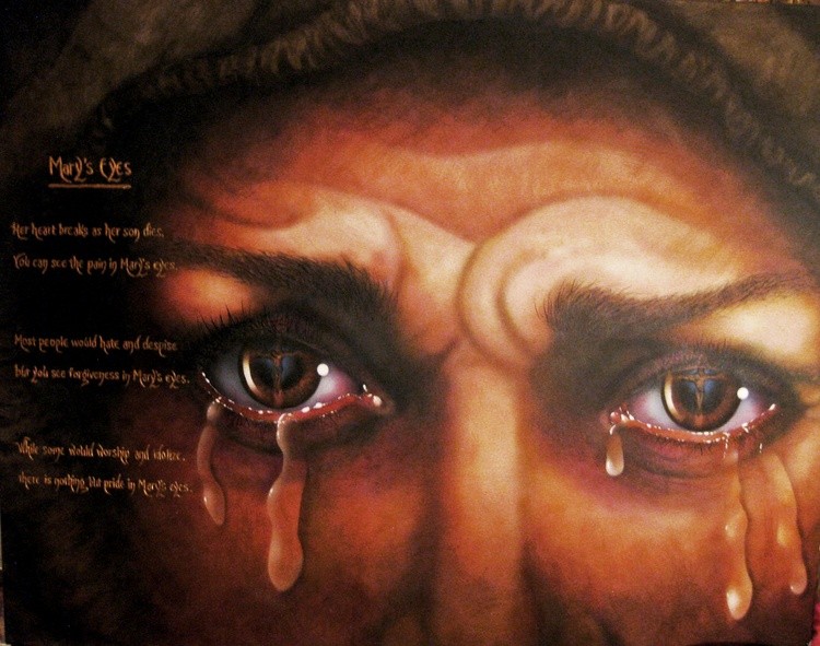 This is a 48x60 gallery wrap canvas. I painted it with acrylic paint using traditional brushes as well as an airbrush. The gold, raised poem on the left hand side reads; Her heart breaks as her son dies, you can see the pain in Mary's eyes. Most people would hate and despise, but you see forgiveness in Mary's eyes. While some would worship and idolize, there is nothing but pride in Mary's eyes.