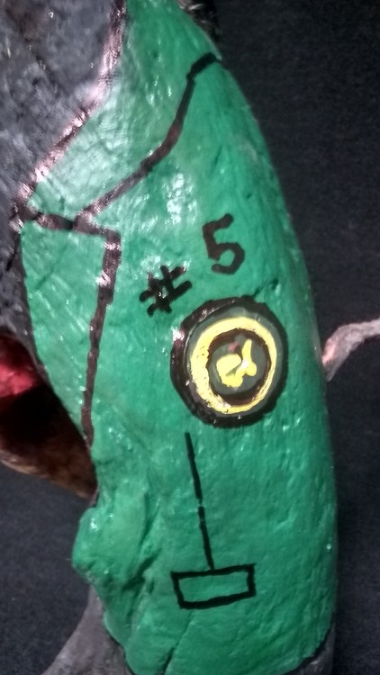 Earth Sculpture standing one foot tall by 6 in wide. It was a burnt piece of wood found on a fire at a beach called Bolinas near San Francisco. It stood as it does now with minor carving and adding touches of giant sea shells representing a hat and the putter. Found at Bolinas CA near San Francisco. Natural hair and yellow eye peas for the eyes. The putter shaft is brass and the tail is dried seaweed also found in Bolinas. I call it " I got! 5 on me, fially got that ELEPHANT off my back !!!
