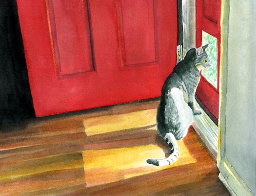 What a wonderful watercolor Yvonne. I love the vivid red of the door, the curious and attentive posture of the cat, and the way the sunshine is cast across the floor. Great job.