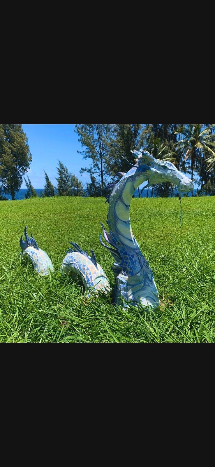 Water dragon sculpture-made with a wire armature then mortar and stained glass in top.