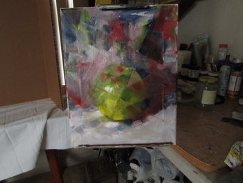Fractured Fruit is an original abstract oil painting on canvas 8x10.