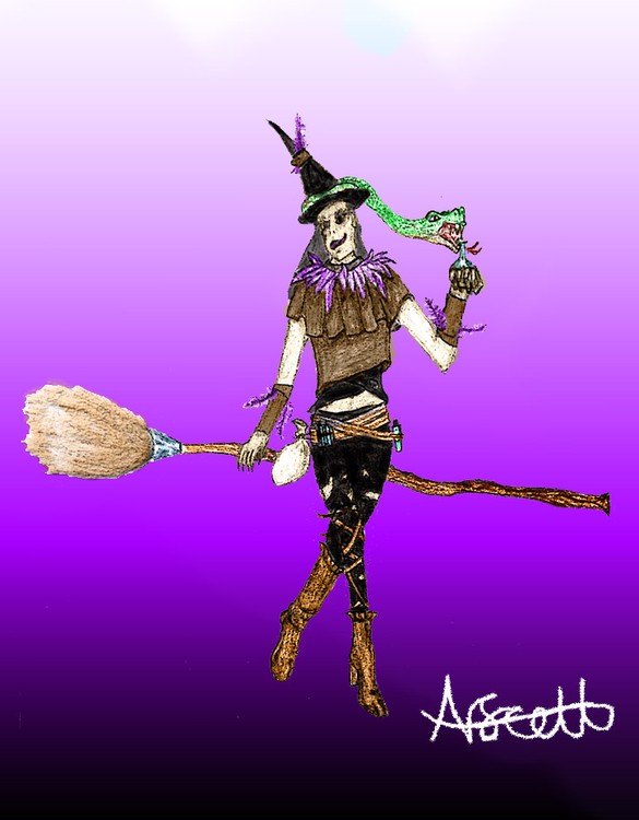 This is an illustration of Madisyn, a young witch who resides in a remote swampland, where she brews elixirs and vile concoctoins with the aid of her pet snake.