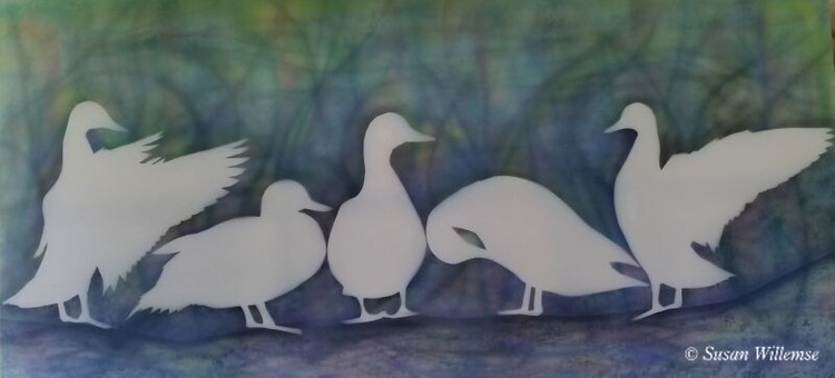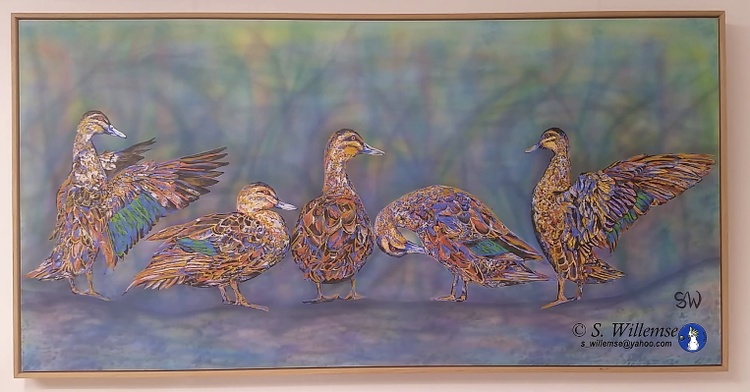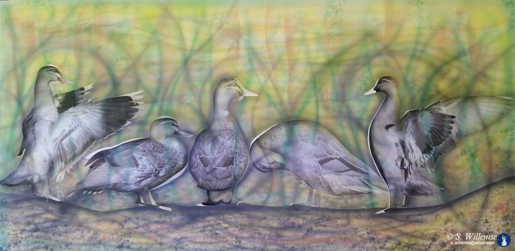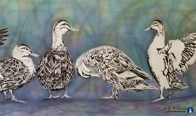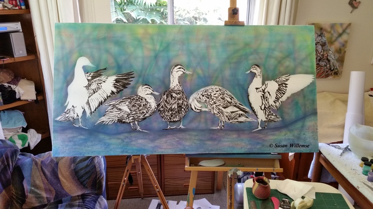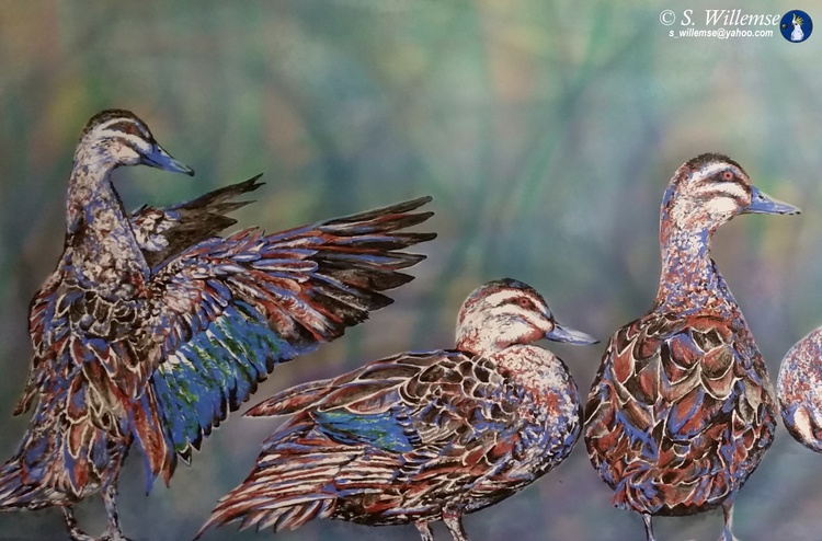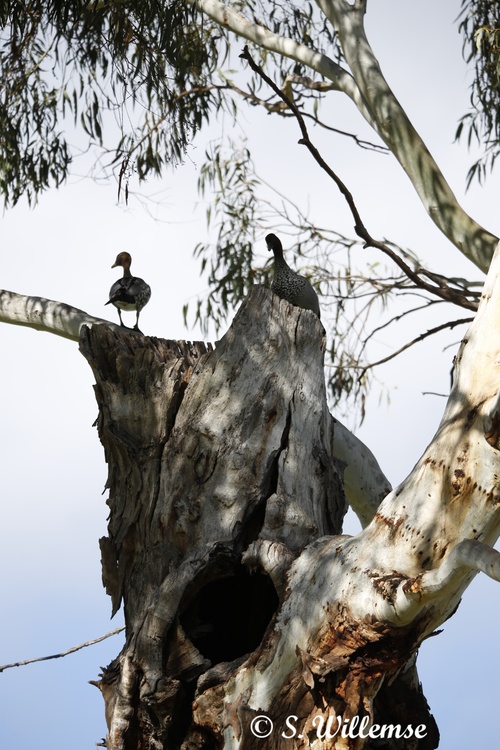Did you know that some Ducks nest in hollow trees and they can often be seen silhouetted against the sky? The process of creating Ducks can be seen on my FB page at https://www.facebook.com/artaustralianbirds/ and one duck that flapped her wings so eloquently posing for our photography that inspired this painting can also been seen here and on my Twitter account. Close up facial details can be seen on Instagram. This is one of my largest works requiring a little time and two easels to paint, it was my first artwork to be released in 2018 and later was shown in the BARK CONTEMPORARY ART EXHIBITION in Gold Creek Station, Hall. This artwork is Framed and comes with a Certificate of Authenticity, photographs referenced were taken by husband and wife avian photographers Steven and Susan Willemse, Canberra, Australia and this artwork can be seen online at https://www.youtube.com/watch?v=QTWWlCITHOM in our Australian birds art Gallery.