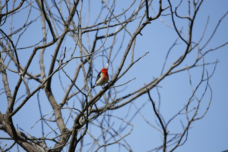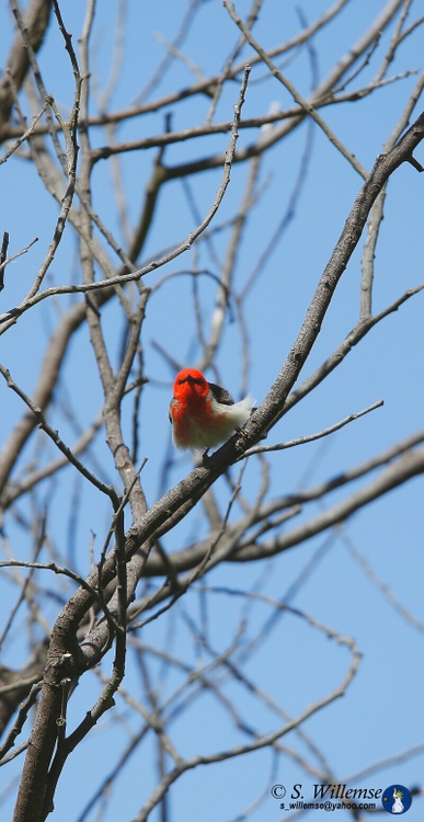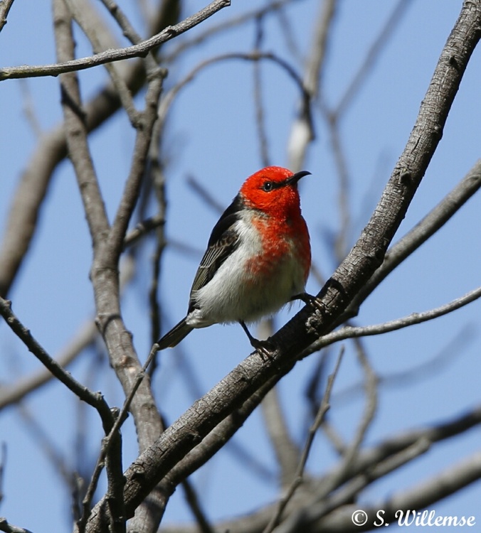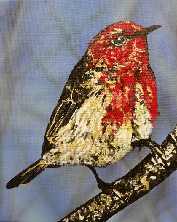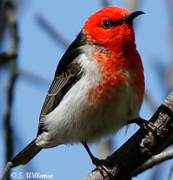 This little bird was the only one in the bare winter branches here in Canberra- we photographed him as he wasn't a common bird seen and the red really stood out against the blue Australian sky, the other photographs in the series were too blurred to help identify the bird as it was windy too so it was only later when we saw a aviculture baby scarlet honey eater that we could study them up close and confirm names for the mistletoe bird is very similar as is the Crimson chat, so our collection of field guides to Australian bird books were studied to get this and just as we use to use exclusion and confirmation criteria in the medical field- no he was not a Mistletoe bird- he didn't have a black hat, possibly a immature male scarlet honey eater fitted our photograph best as the red headed honey eater was excluded geographically and the chat has a full red tummy with a white bib. Who says bird watchers don't get scientific. I hope you enjoy this rare little find as much as we did.