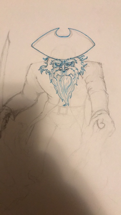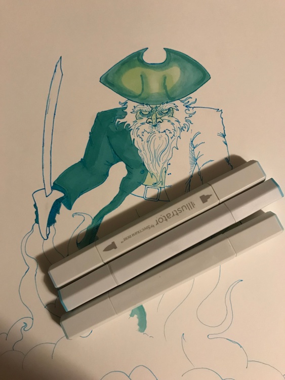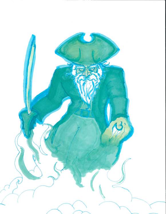 An ink and alcohol illustration overlaid a digitally adjusted photo of a Pirate Ghost Captain haunting a nighttime shipwreck.