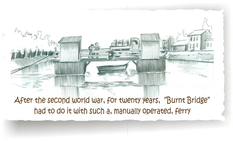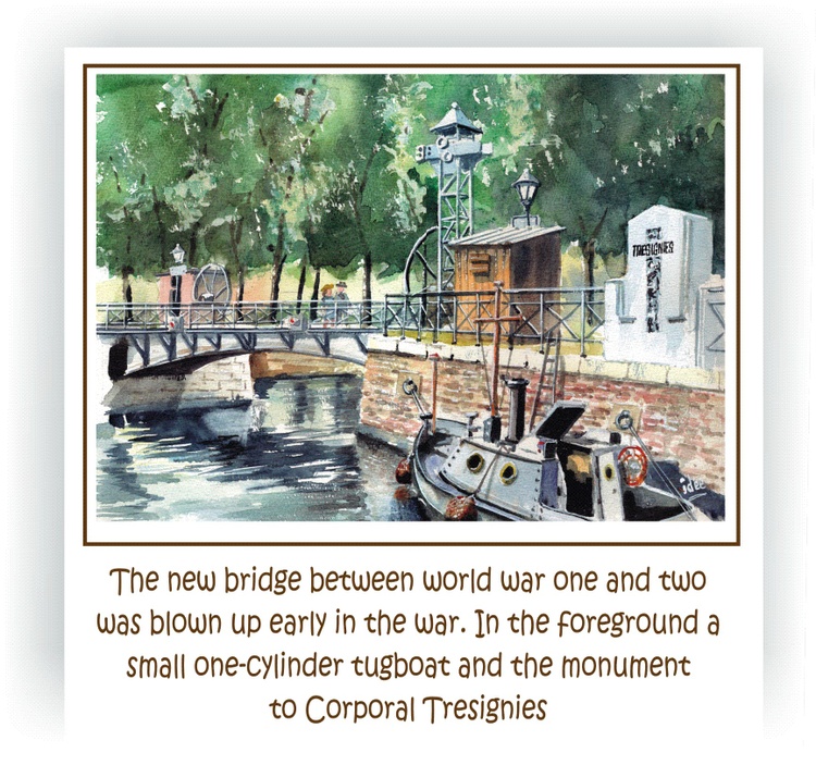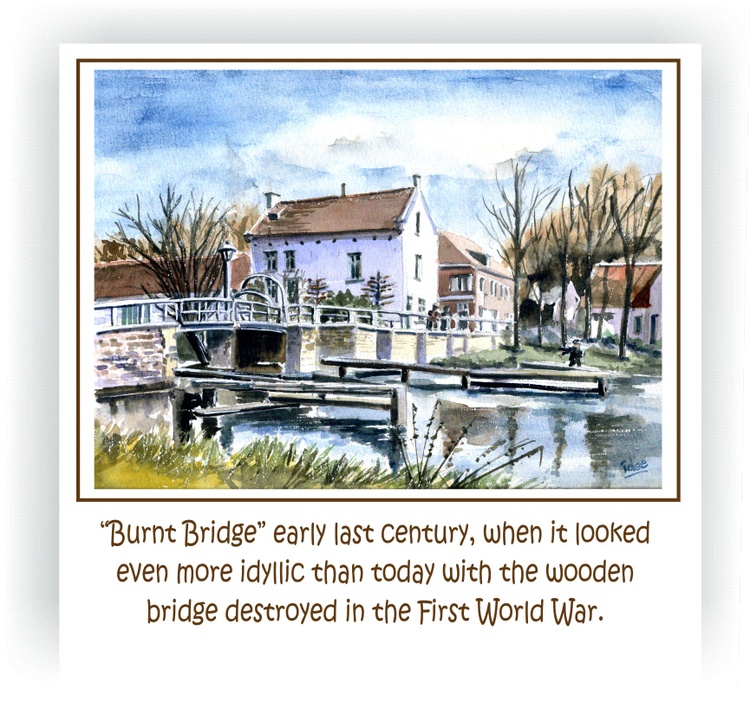 Since the bridge of the village of Heienbeek was torched in the late 16th century stabbed, this hamlet is stuck with the name Burnt bridge. An average village but strongly connected to it Brussels - Scheldt canal. The watercolor shows a tow of cargo ships drawn towards Brussels.