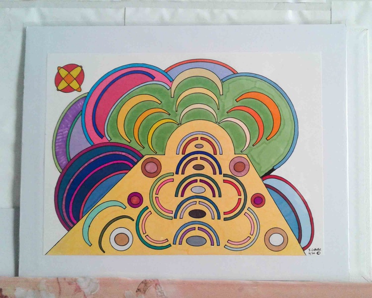 As I trek through the tropical jungle in my head I'm astounded at the temple in front of me. The magic of the Mayans capture my attention as it emits glorious energy fields that welcome my inner spirit. Marker on paper, mounted, unmatted, and sealed. Measures 14x11