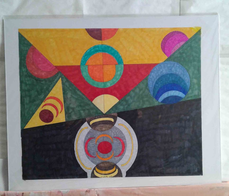 An uneven balancing act, what goes on the left of the scale usually does not equate to the right. Basic geometric with just a few template shapes. Marker on paper, mounted, unmatted and sealed. Measures 20x16