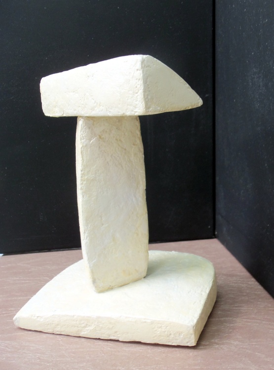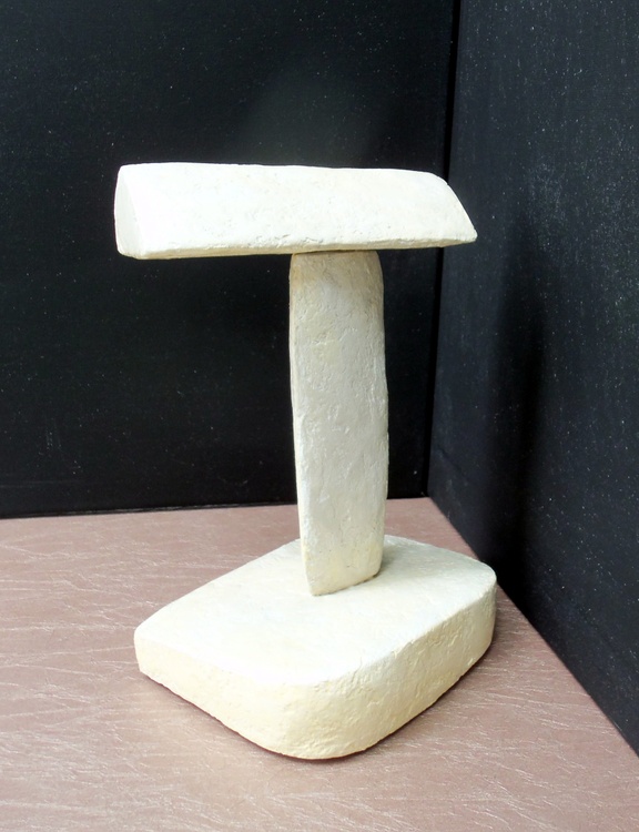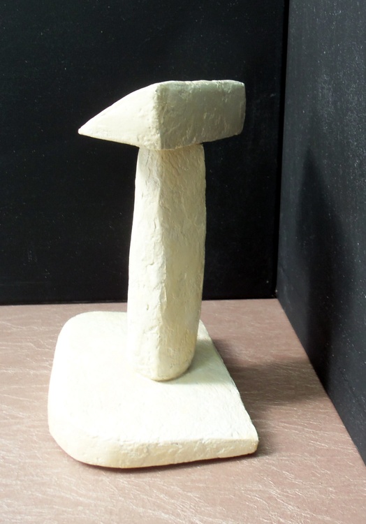 This is the second sculpture in my 'Three-Part Harmony' series. If you read my explanation of the first, you know I attempted to find a certain 'harmony' by combining pieces I had constructed willy-nilly. One of the prerequisites was that the parts found and combined had to stand on their own. This was crucial. T Bar stands 7.75 inches at its peak, 5.5 inches wide and 4 inches deep. It, like Umbrella, is composed of my 21st Century papier mach'e compound covering Styrofoam. It is finished with polymer varnish with a light yellowish brown tone. Yes, Original Jones Art is harking back to his primal roots, imagining northwest Austin, Texas to be home to a prehistoric lake.