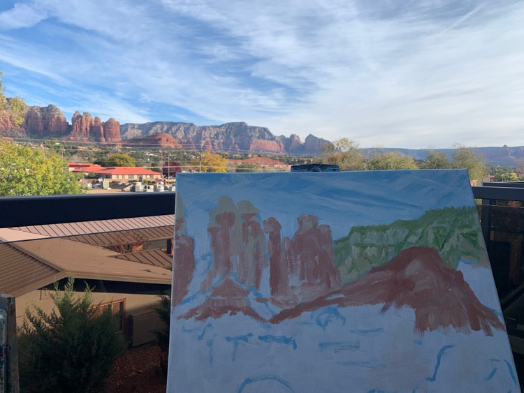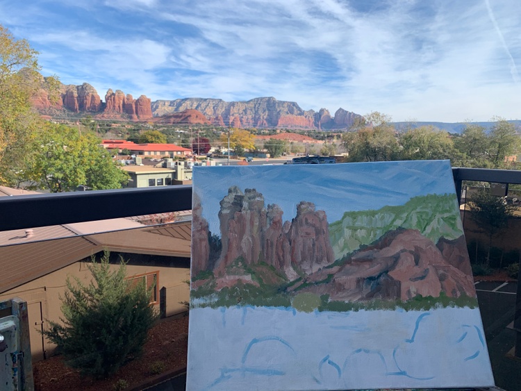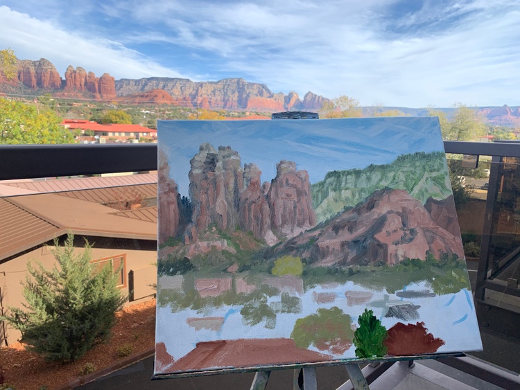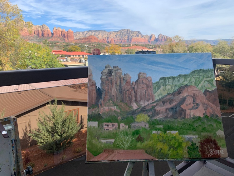 This is a plein air painting, done in oils on a canvas board, during a paint-out in Sedona, AZ, from the balcony of my hotel room. It is 16 x 20" and is framed in a gold frame. See project images for the painting in process.
